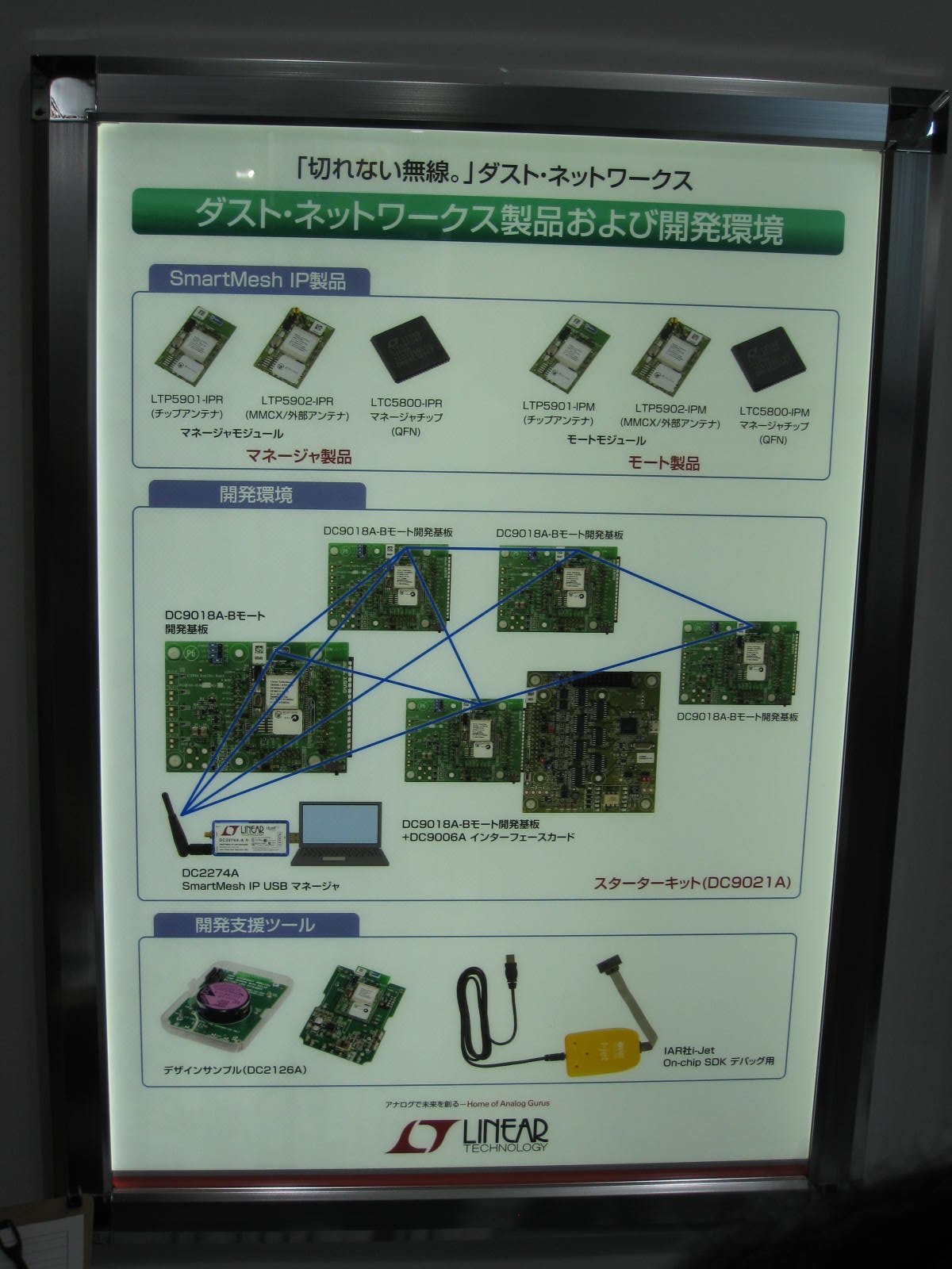 リニアテクノロジー社のブースでは,昨年に引き続き2.4GHz帯の「ダスト・ネットワークス」関連製品を展示していました.左はその説明パネルです.ダスト・コンソーシアムはこちら.