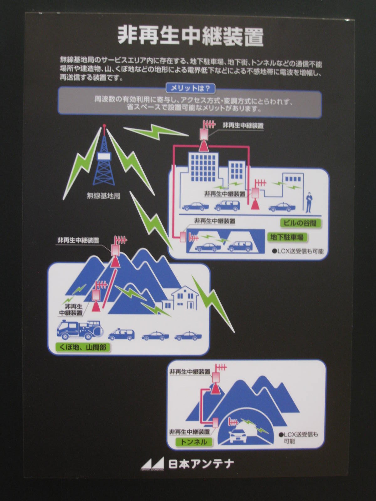 日本アンテナのブースでは,260MHz帯のディジタル消防/救急無線や400MHz帯の業務用ディジタル無線の不感地帯対策としてギャップフィラー局が展示されていました.